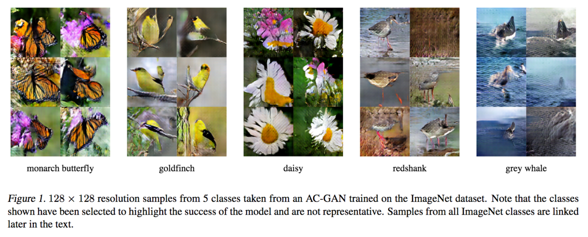 構造を見た際にAC-GANは既存のモデルと大きく異なる(tremendously different)わけではないとされていますが、AC-GANにおける修正(クラスラベルの分類を補助タスクとして加える)によって学習を安定させることができているようだとされています。